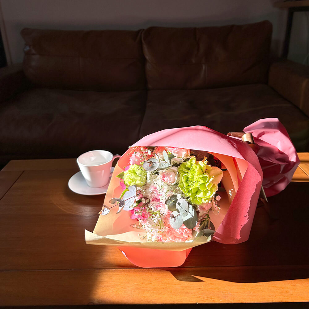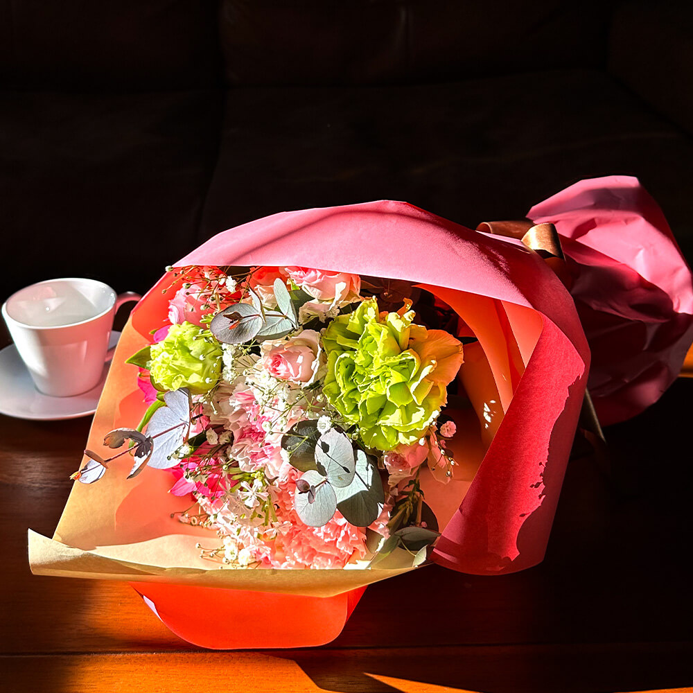 市場でその日一番状態の良いお花を厳選してお作りするため、花材の種類は写真と異なる場合がございます。お写真の「色合い」や「ボリューム感」のイメージを大切に、プロのフローリストが一つひとつ丁寧にお仕立ていたします。
